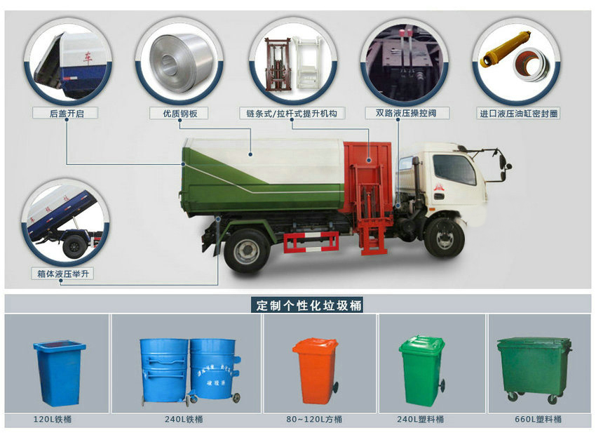 標(biāo)準(zhǔn): 掛桶式自裝卸垃圾車:采用鏈條和液壓油缸聯(lián)動(dòng)裝置,實(shí)現(xiàn)對(duì)垃圾桶提升和翻轉(zhuǎn),將多處垃圾桶內(nèi)的垃圾自動(dòng)收入車廂內(nèi),并到目的地一次性自卸出來(lái)。