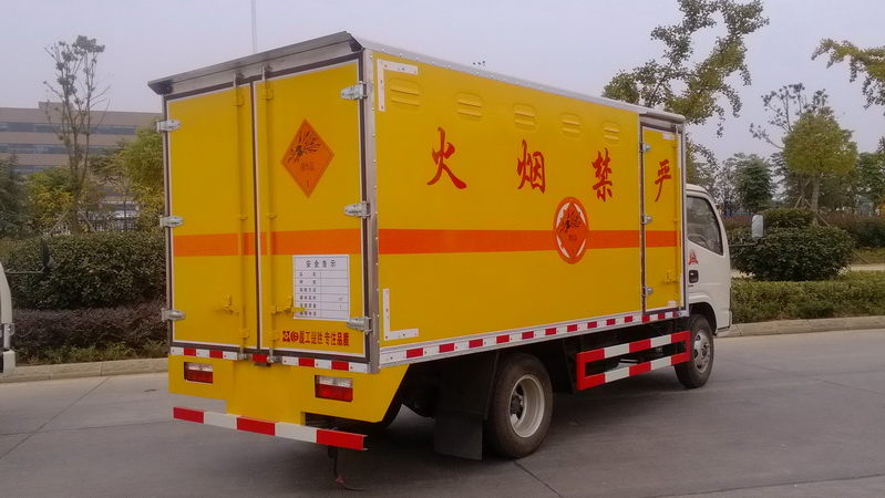 廂體頂部封閉,不可開(kāi)啟, 該車隨底盤選裝駕駛室,選裝右側(cè)面單門安裝位置靠近廂體前部;防護(hù)材料:Q235A碳鋼,連接方式:左右側(cè)面防護(hù)均采用焊接連接,后下部防護(hù)與車架采用焊接連接,后部防護(hù)斷面尺寸(mm):120?0,后部防護(hù)離地高度(mm):450。運(yùn)輸品名:炸藥,雷管,煙花爆竹等,類項(xiàng)號(hào):1.1B,1.1D,1.1G,1.2G,1.3G,1.4G 等。選用ISD180 50,YC6JA180-50型號(hào)發(fā)動(dòng)機(jī),對(duì)應(yīng)油耗值(L/100km)分別為:26.8,27.1,整車長(zhǎng)度與軸距對(duì)應(yīng)關(guān)系(mm):8990/5100,8590/4700。該車安裝具有衛(wèi)星定位功能的行駛記錄儀,僅采用底盤子午線輪胎和帶ABS的底盤; 該車前置排氣管,安裝限速裝置,限速80km/h, ABS型號(hào)為ABS-E 4S/4M,生產(chǎn)企業(yè)是威伯科汽車控制系統(tǒng)(中國(guó))有限公司。